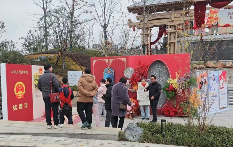 除了在登记中心完成领证,新人们还收获了一份特别的仪式感——中心特别在园博园设置了浪漫打卡点。完成登记的新人们来到园博园,在如画风景中拍照留念,定格甜蜜瞬间。工作人员也专程到场,为新人们送上新婚祝福。