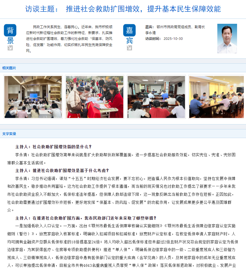 【访谈解读】访谈主题:推进社会救助扩围增效,提升基本民生保障效能